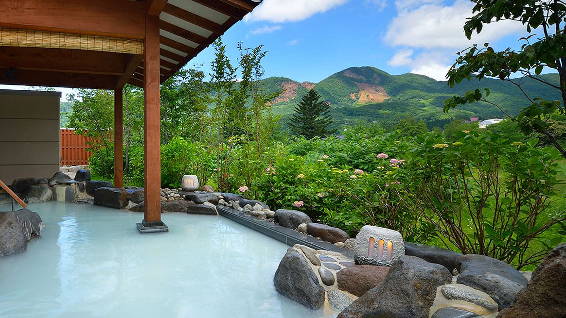 蔵王の自然を眺めながら入る露天風呂と総木造りの内風呂。乳白色の硫黄泉をゆったりと楽しめます。